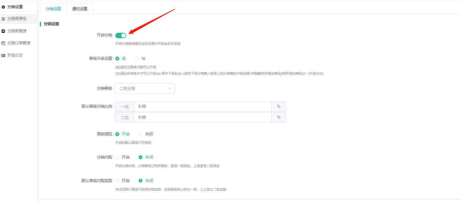限制提现:开启限制提现,默认等级分销商则不可操作所有收入提现申请,开启后前端申请时会显示:不满足分销商等级,不可提现。